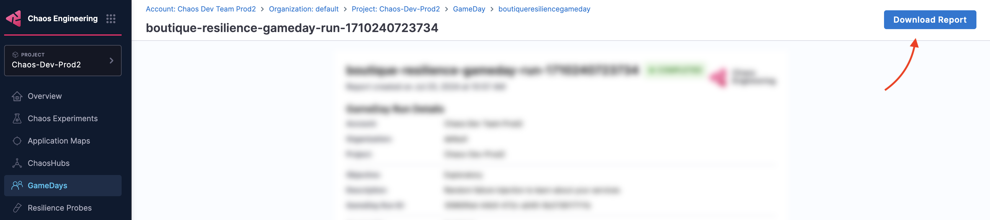 1. To download the report, select Download Report on the page where you view the GameDay run report.