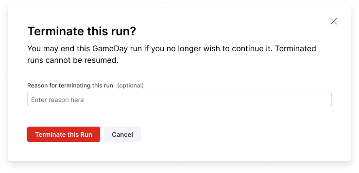 • Select Terminate GameDay Run to stop GameDay execution. Select Terminate this run to confirm.