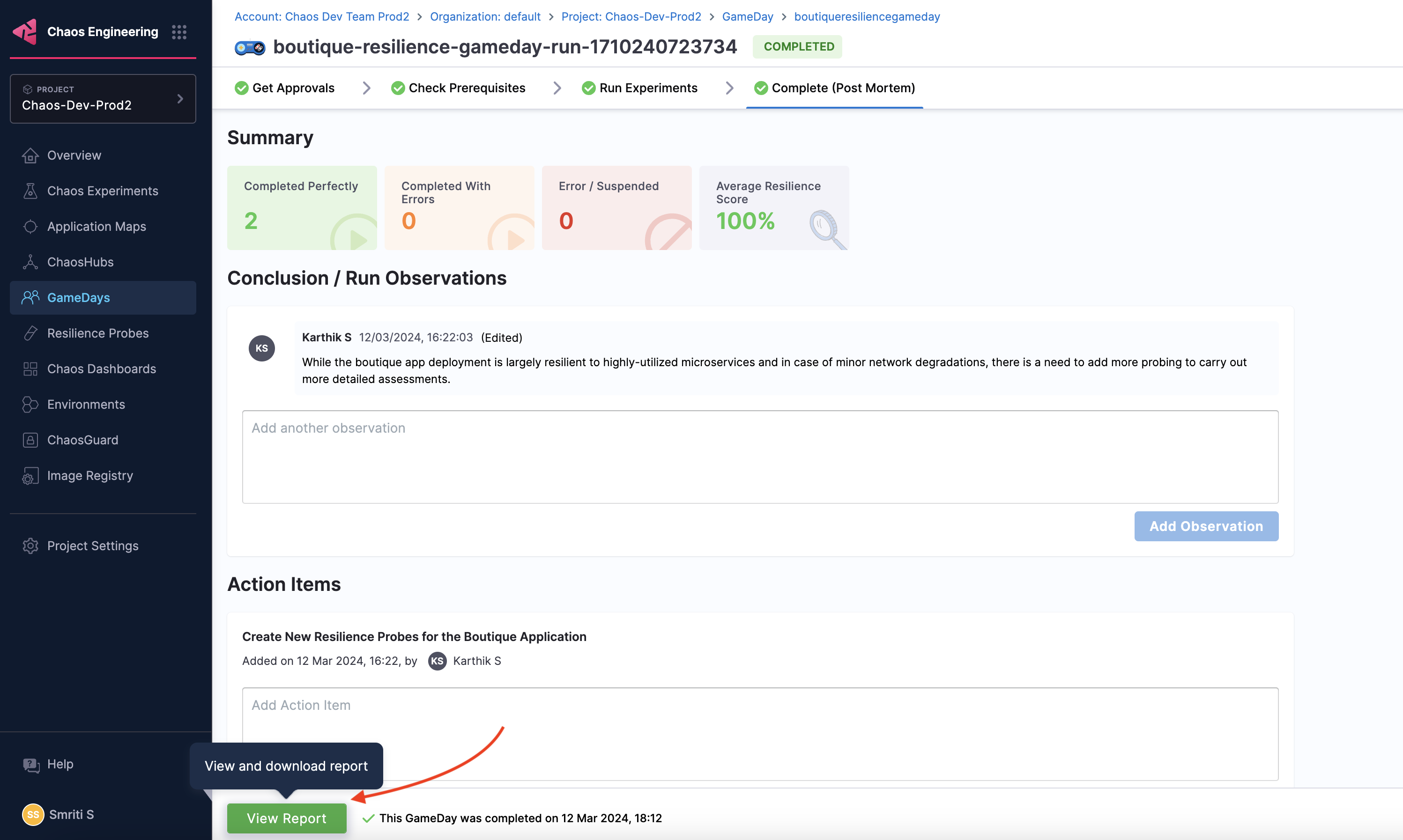 To view the GameDay run report, navigate to your GameDay run and select View Report.