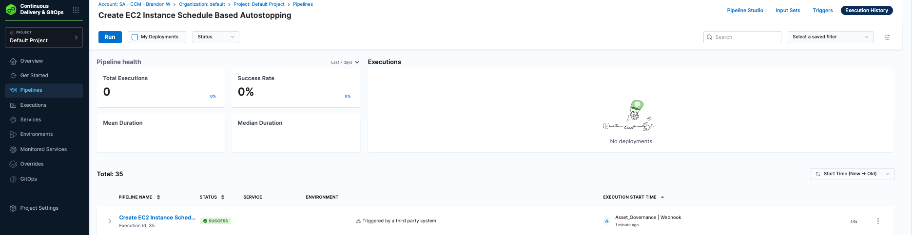 To accomplish this, we use CCM Asset Governance to locate the resources and a Harness pipeline to automate the creation of the autostopping rules and their schedules.