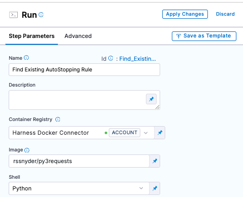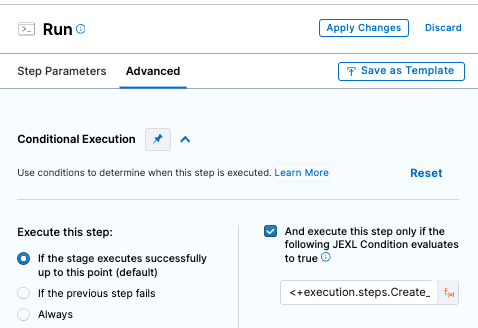 • Go to the Advanced tab and configure a conditional execution only if 'Find Existing Autostopping Rule' doesn't find a rule: <+steps.Find_Existing_AutoStopping_Rule.output.outputVariables.RULE_ID> == ""
