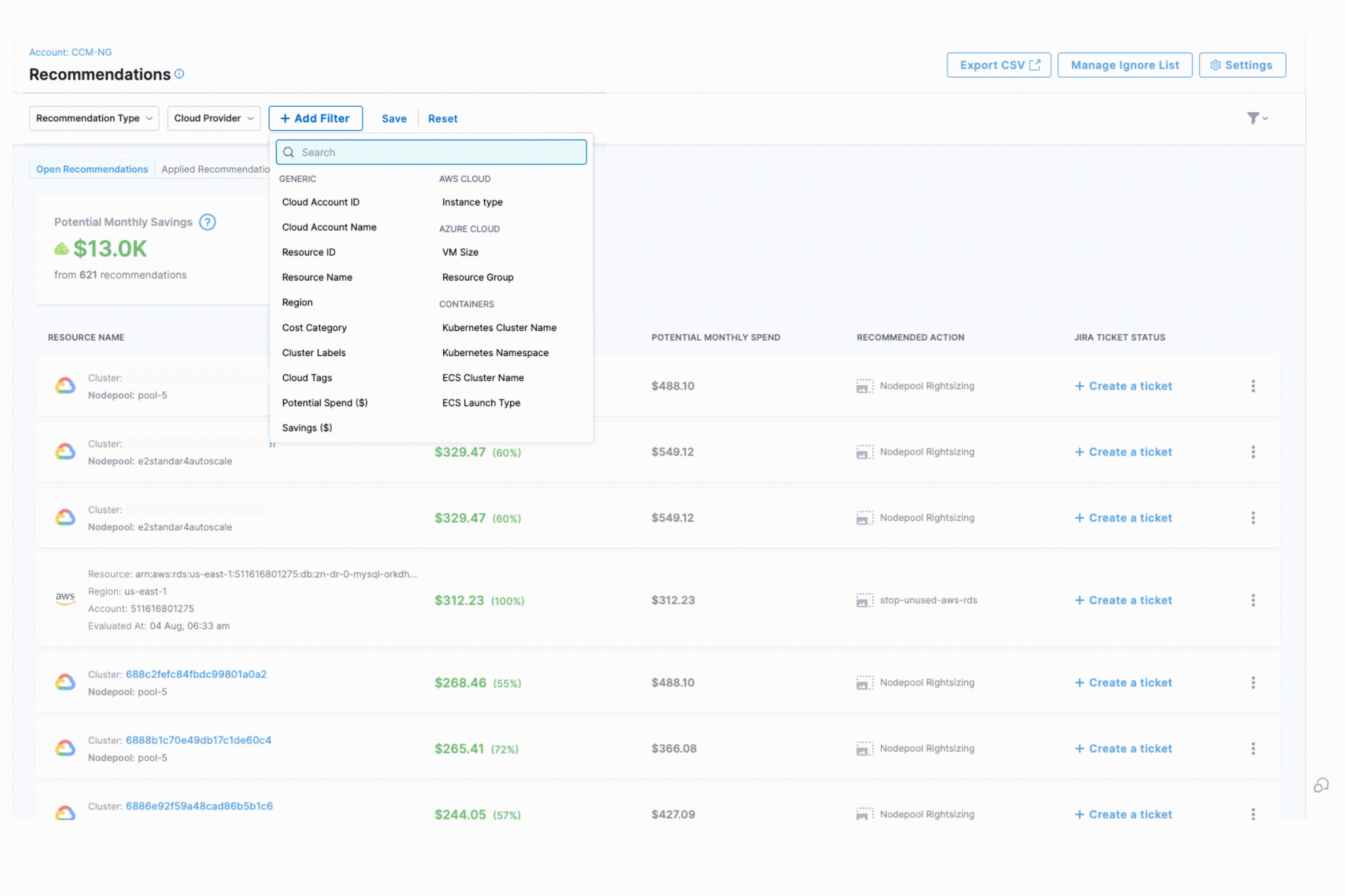 - Generic Filters: Cloud Account ID, Cloud Account Name, Resource ID, Resource Name, Region, Cost Category, Cluster Labels, Cloud Tags, Potential Spend(USD), Savings (USD), Governance Rule Name