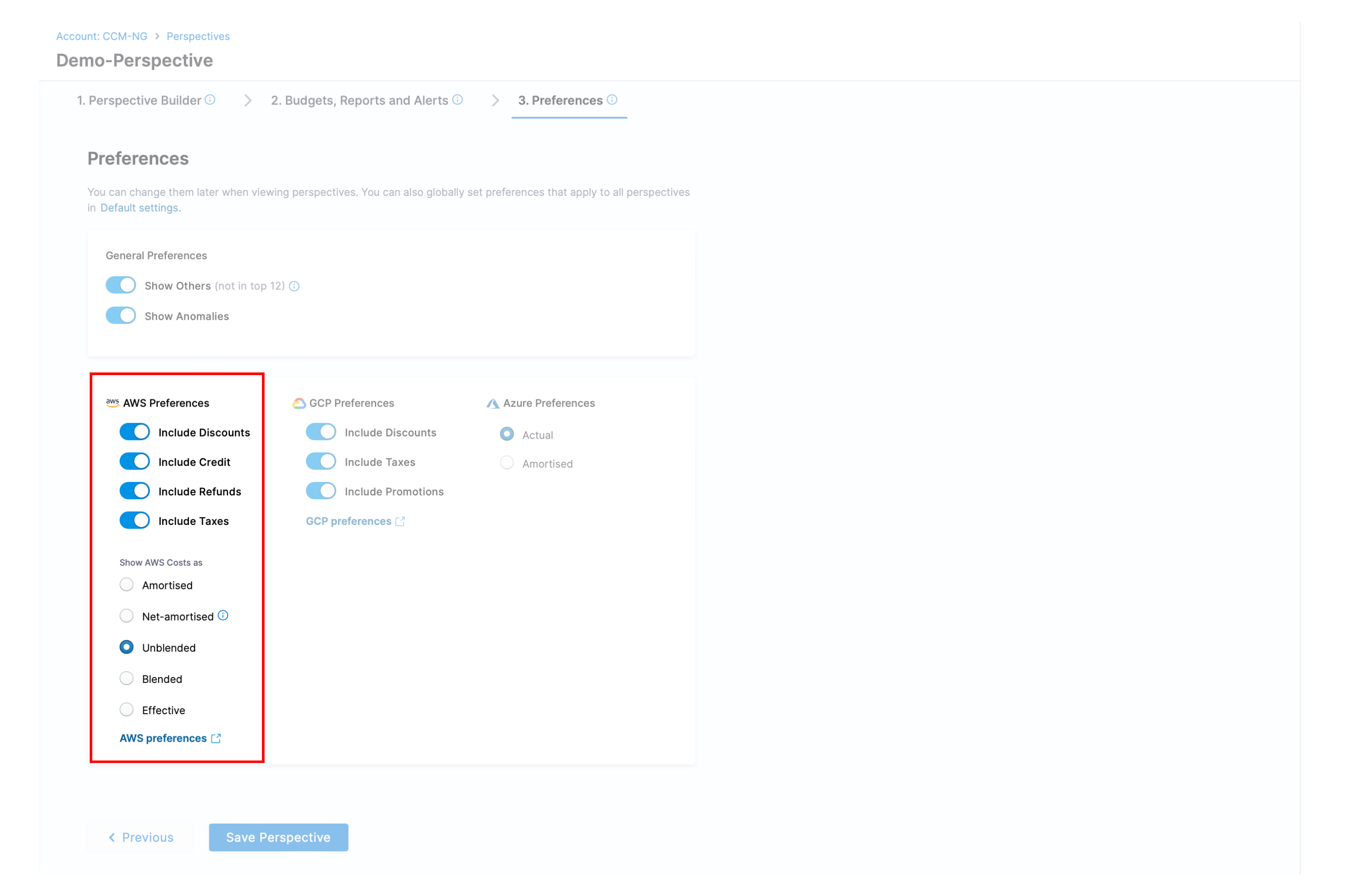 When creating your perspective, the Preferences section allows you to include specific cost factors sourced from the AWS Cost and Usage Reports (AWS CUR). These selected cost factors will be incorporated into your perspective for a more tailored and comprehensive view of your cloud costs.