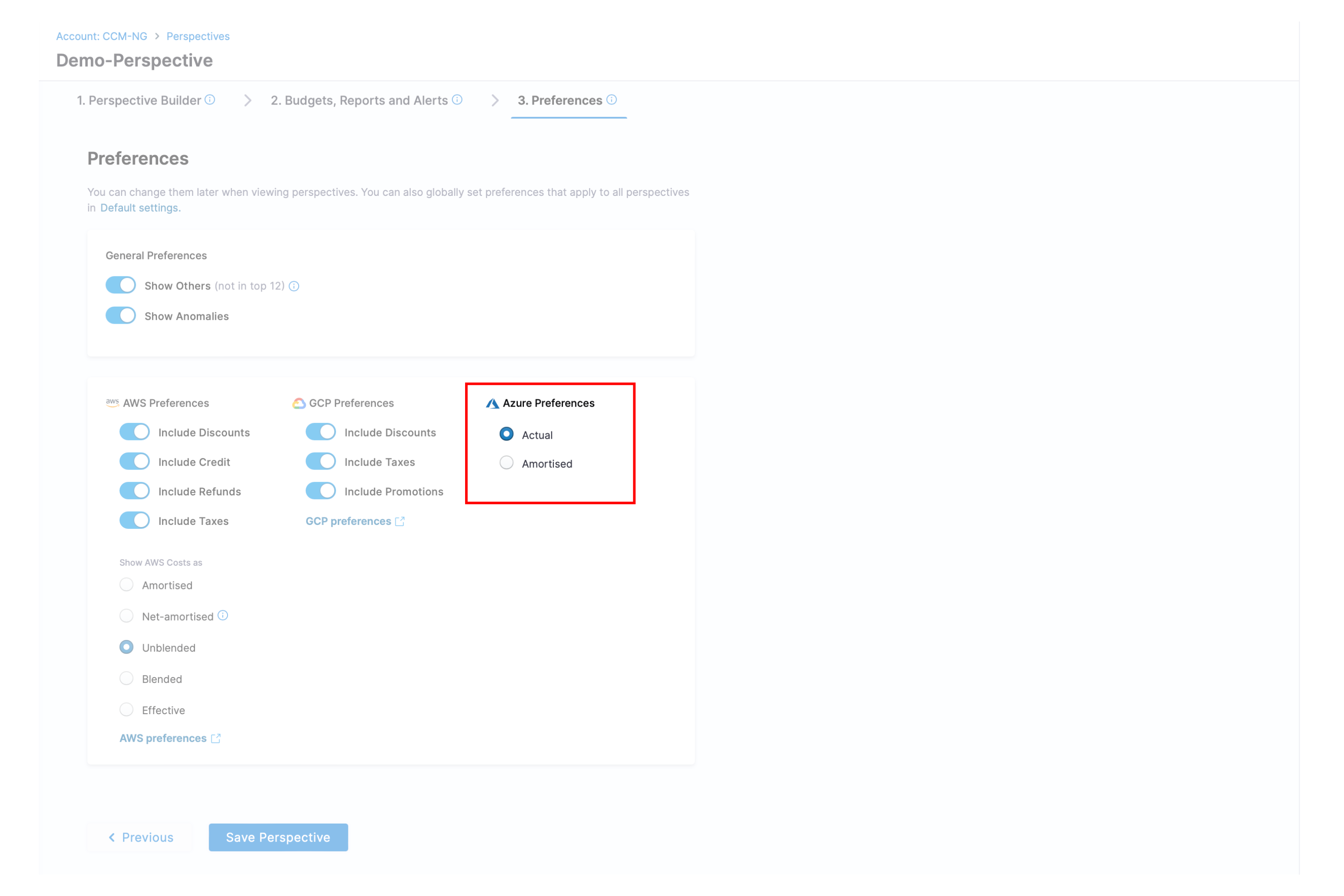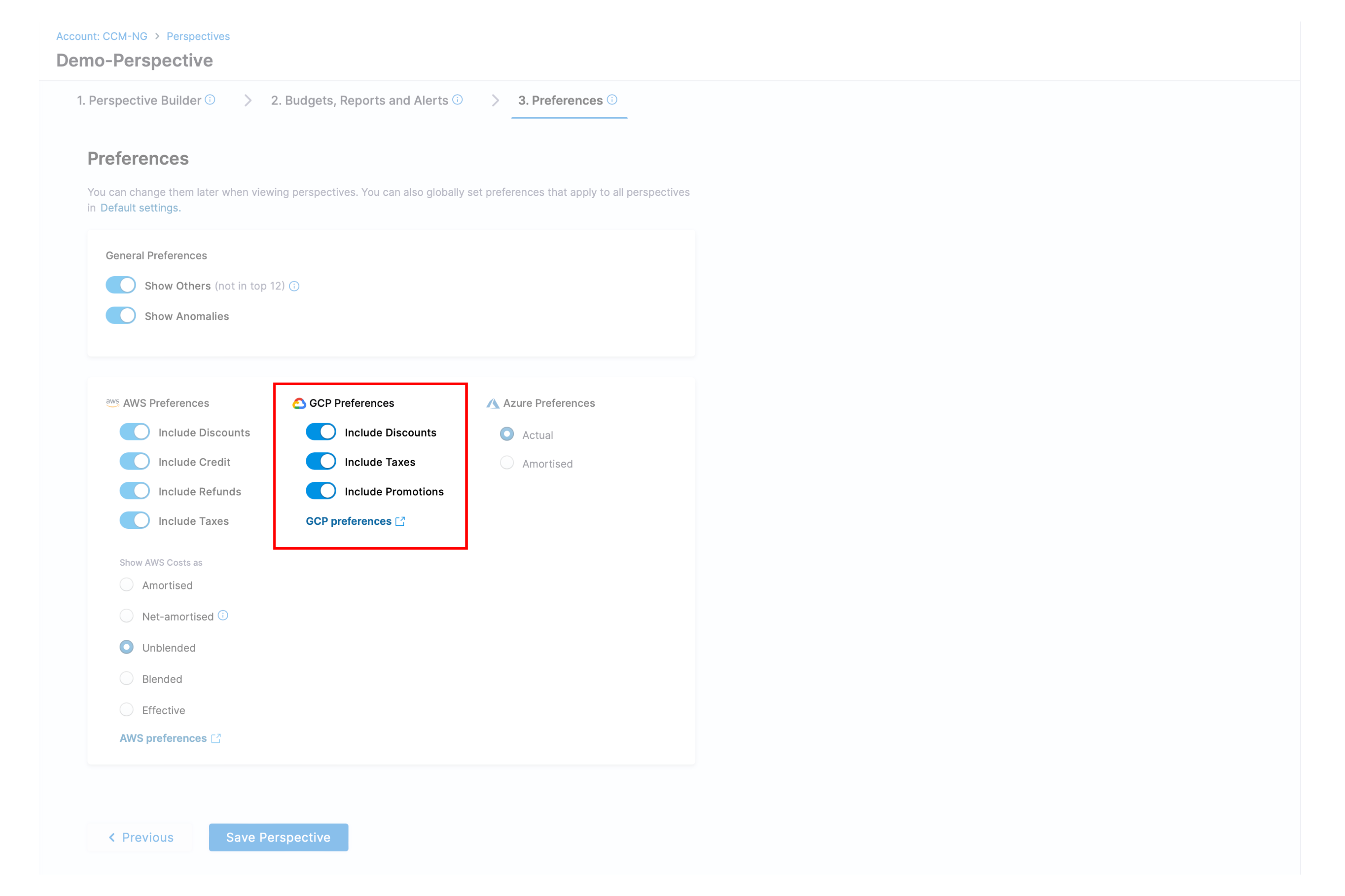 With perspective preferences, you have the flexibility to tailor the cost data presented in your perspective. You can opt to include or exclude specific cost data provided by the Cloud Service Providers (CSPs) according to your needs and requirements.