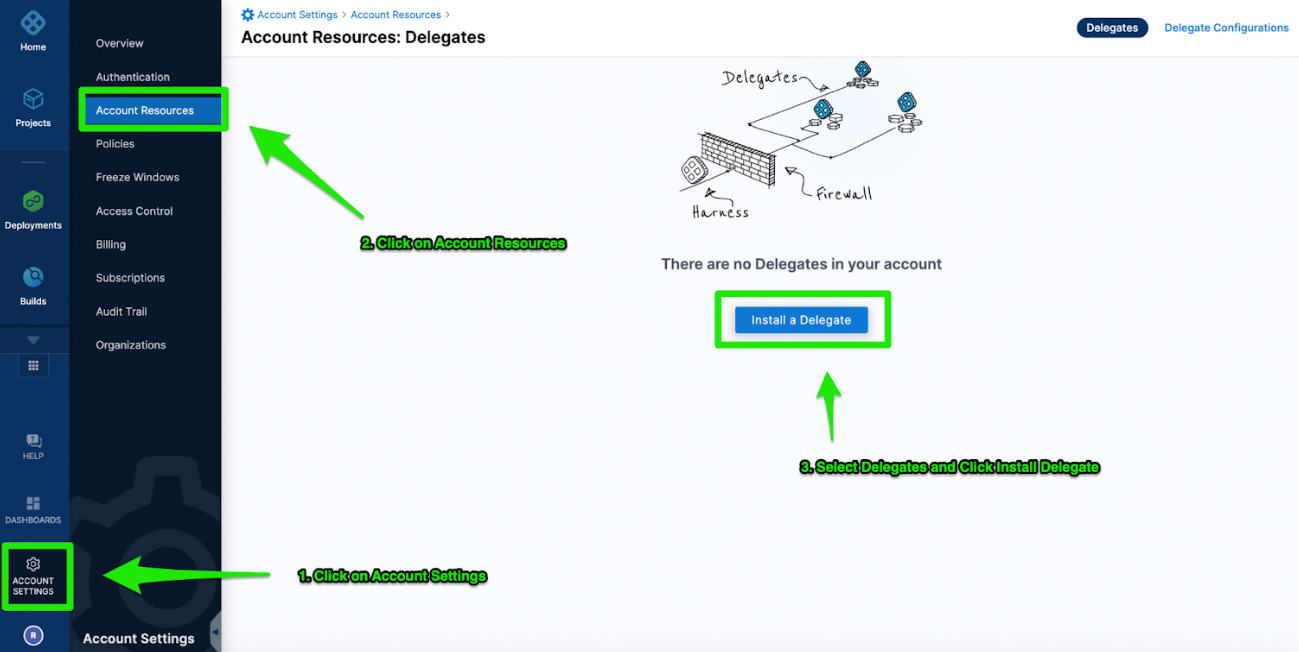 After the delegate is installed and registers with Harness, you connect Harness to third party resources.