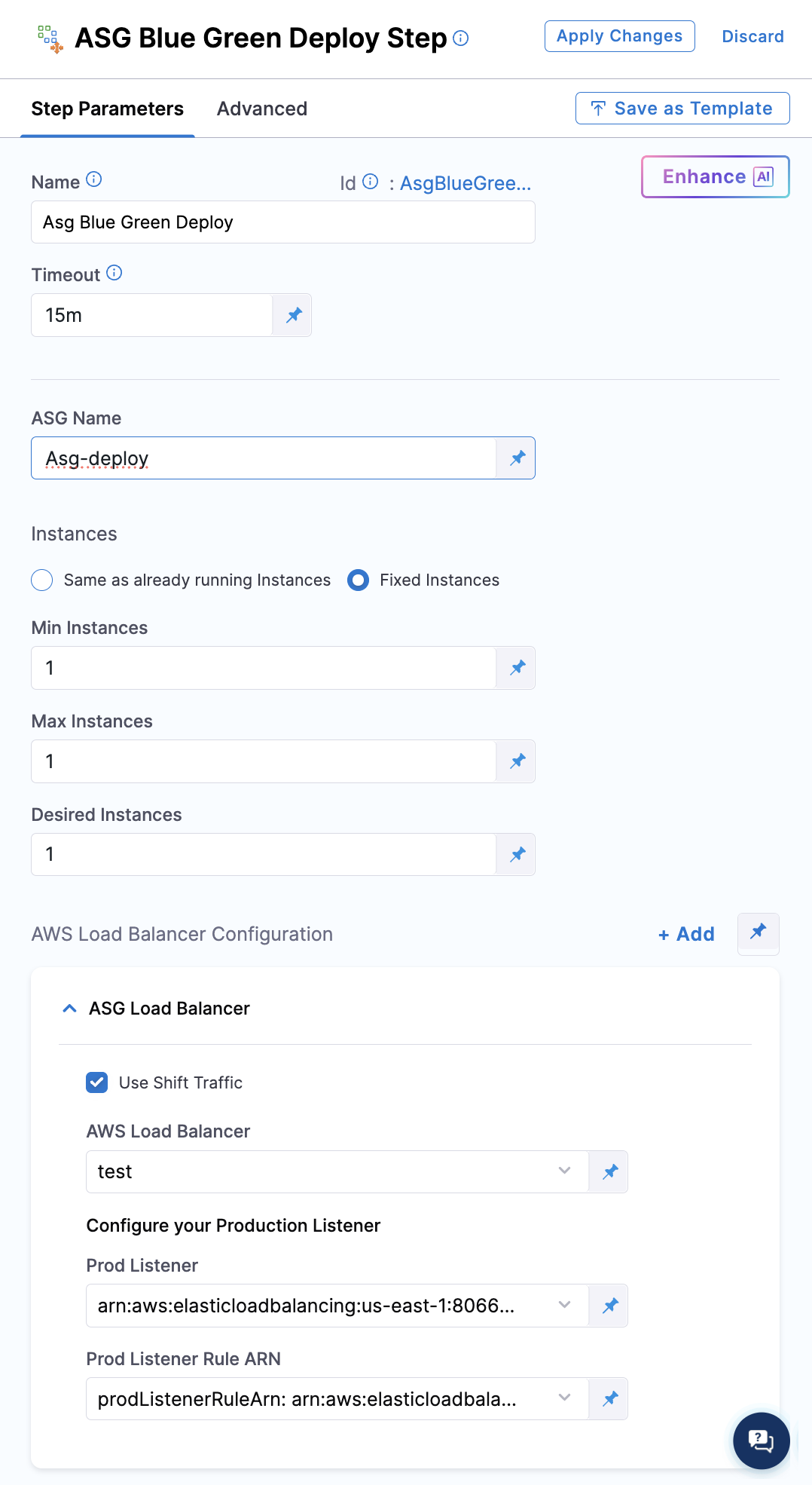 In the ASG Blue-Green Traffic Shifting Step, you define the production and stage listener ports and rules that the ASG Blue Green Deploy step uses. Then, the ASG Swap Services step shifts all traffic from the stage target group back to production.