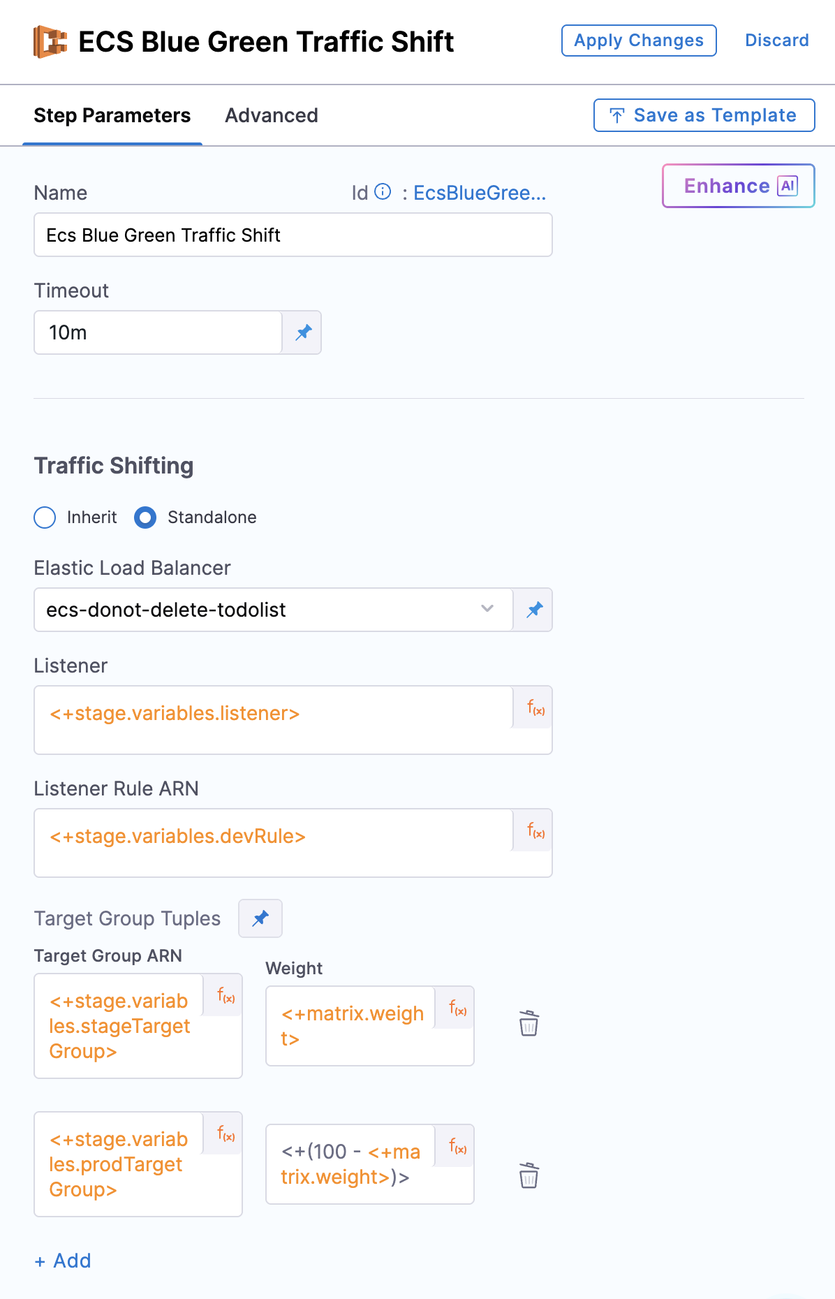 isTrafficShift: true. Optionally leavestageTargetGroupArnempty for automatic discovery (recommended), or provide a specific target group ARN for manual control. - Add an ECS Traffic Shift step (inherit or standalone) to begin shifting traffic incrementally.