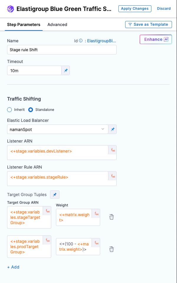 isTrafficShift: trueand provide thestageTargetGroupArn. - Add an Elastigroup Blue Green Traffic step (inherit or standalone) to begin shifting traffic incrementally.