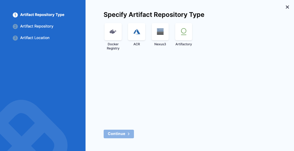 Currently, Harness supports Docker Registry, ACR, Nexus3, and Artifactory for artifact repositories. Choose where your artifact is stored, and click Continue.