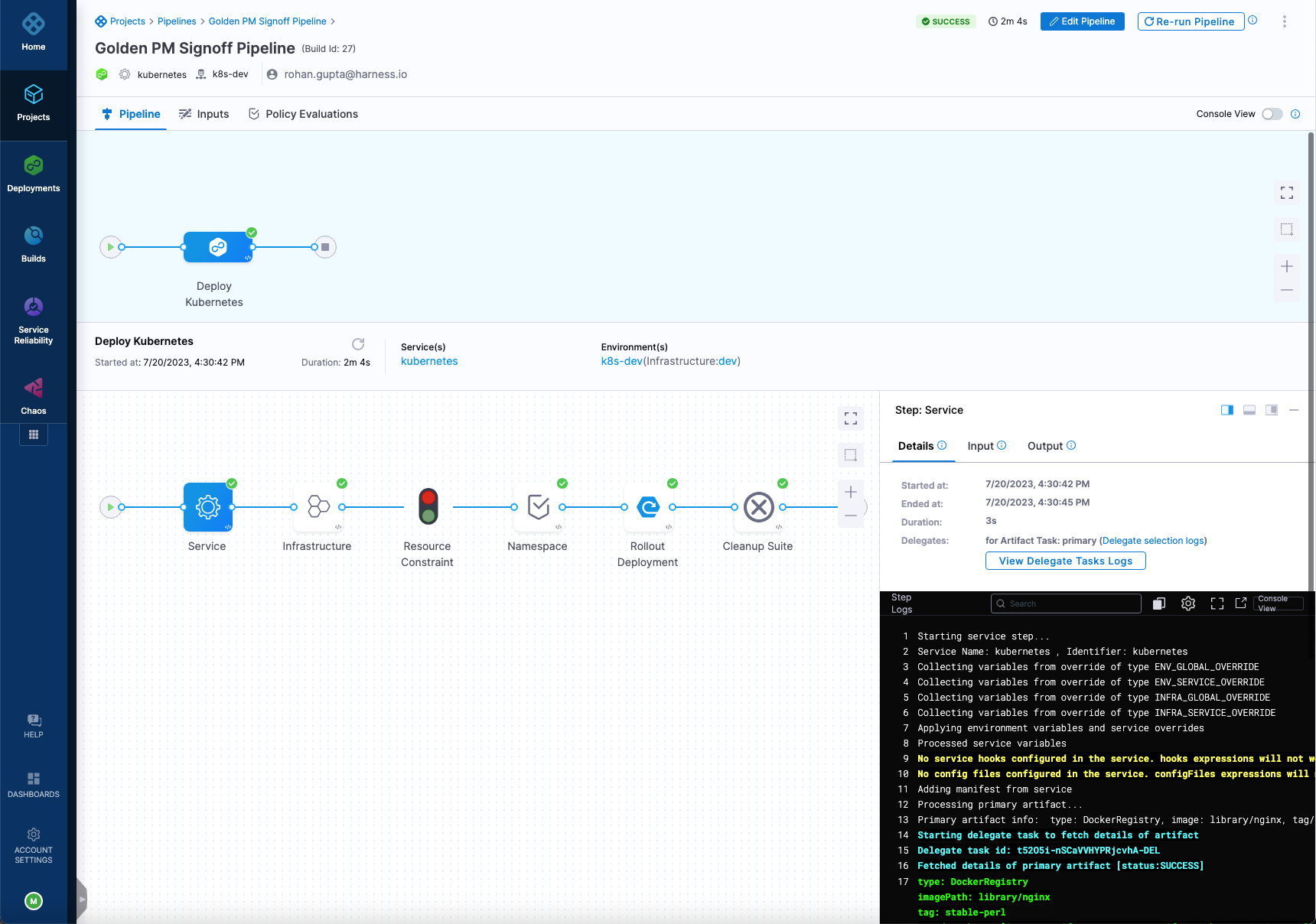 In this example, there is Rollout Deployment step to deploy the service to the environment.