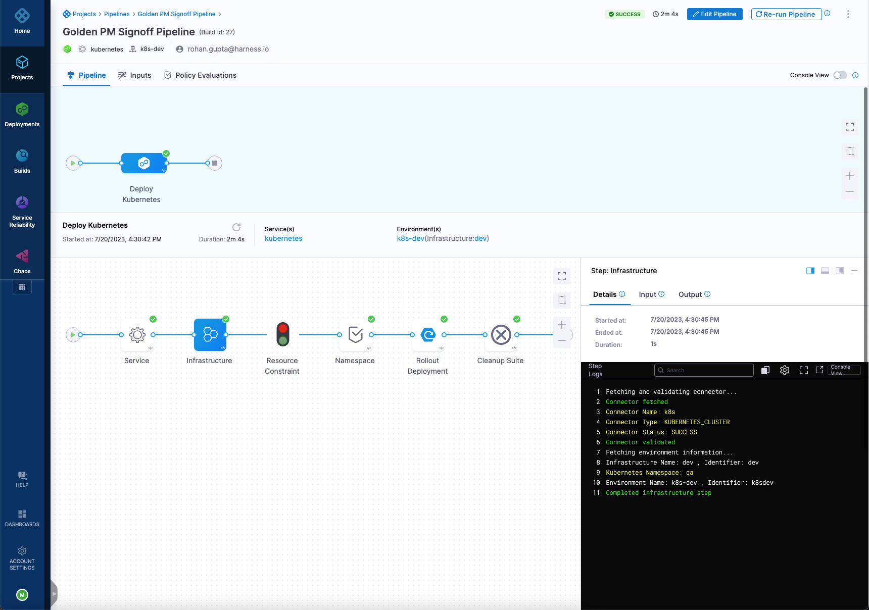 1. The Kubernetes rollout deployment task leverages the infrastructure definition and Harness Kubernetes Cluster connector to authenticate and deploy into the target cluster.