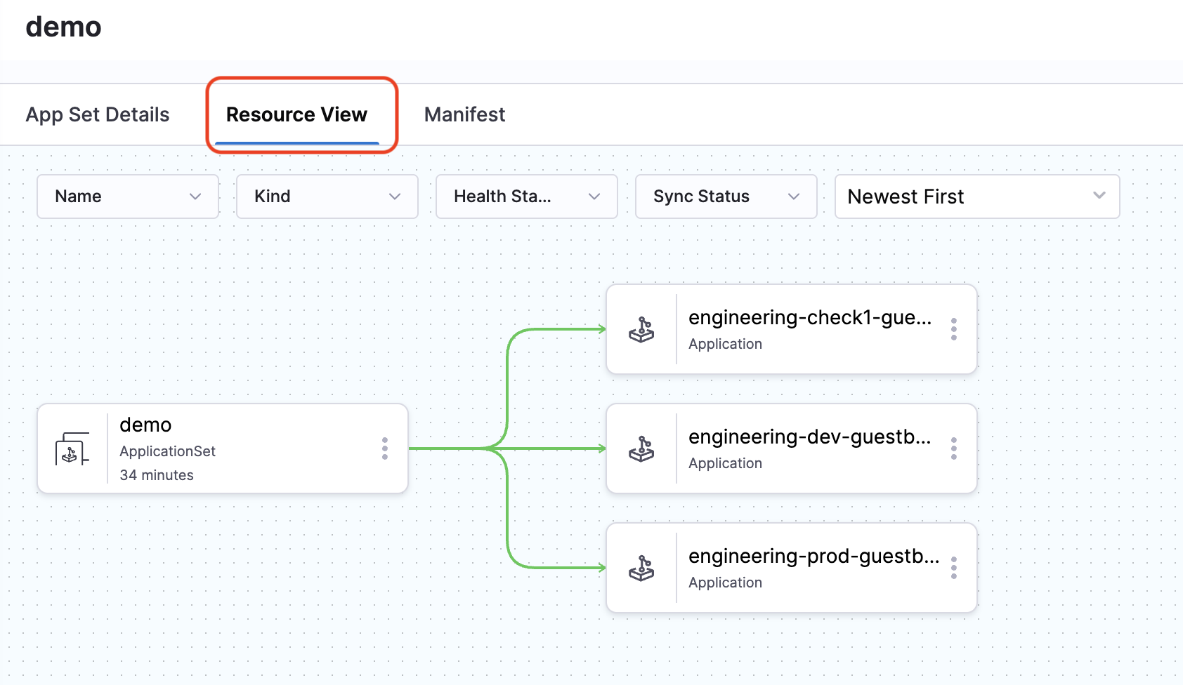 When viewing the ApplicationSet resource tree, child application objects may appear out of sync even if the individual application page shows a synced status. This is because the ApplicationSet resource tree refreshes every 3 minutes by default. For the most up-to-date status of a specific application, click on the application to view its dedicated details page.