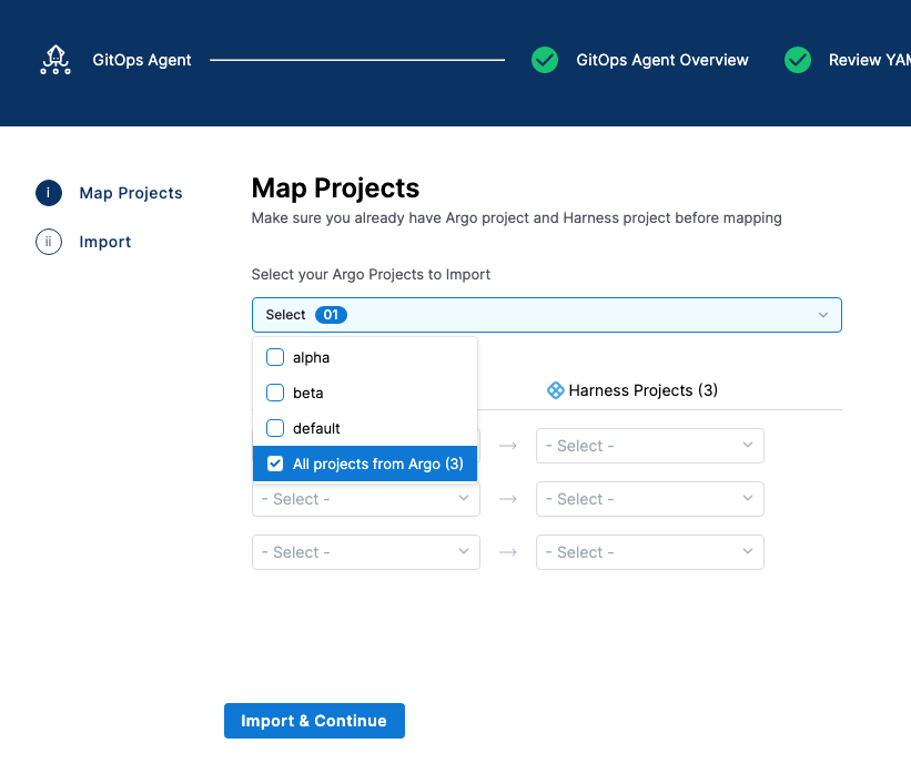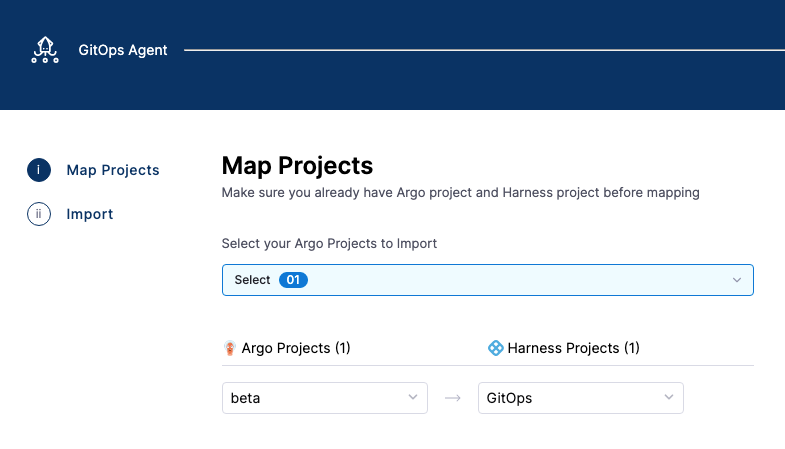 To map your existing Argo CD projects to Harness projects, select the Argo CD projects you want to use, and then select the Harness project where you want to map the Argo CD project.