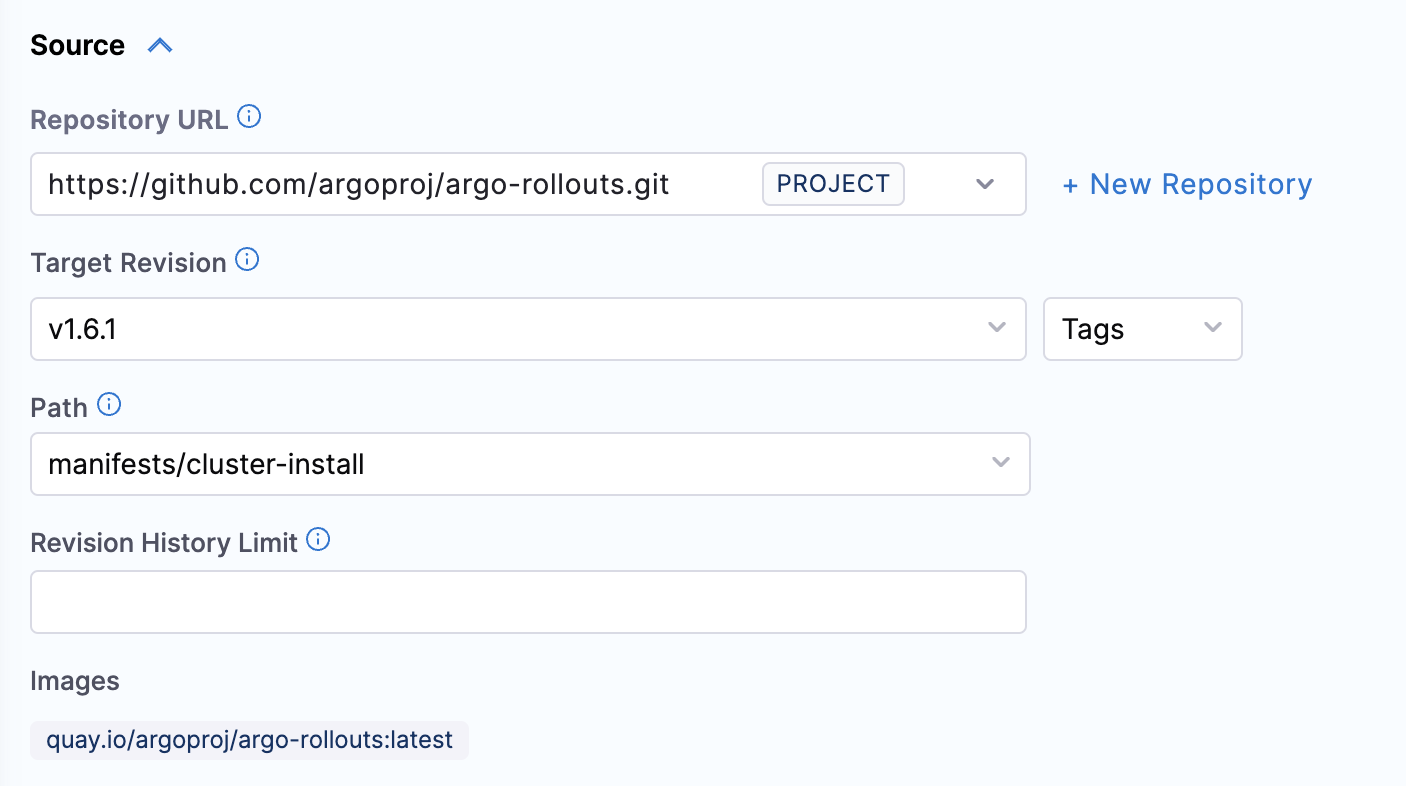 1. Create a new Argo CD application. Its name and sync options are up to you, but make sure that you are using the same GitOps agent that you installed Argo Rollouts into above.