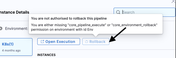 A user will only be allowed to execute rollbacks on any instance if they possess these two permissions for the pipeline and environment through which the deployment occurred. Otherwise, they will see the following message when attempting to click Rollback.
