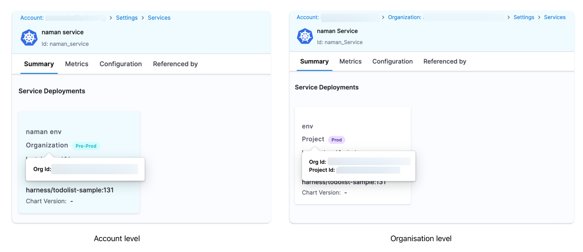 1. To distinguish between environments, hover over the Organisation/Project in the card to view the org_id and project_id of the service deployment. You can view the deployments in the Environment, Artifacts, or Charts view.
