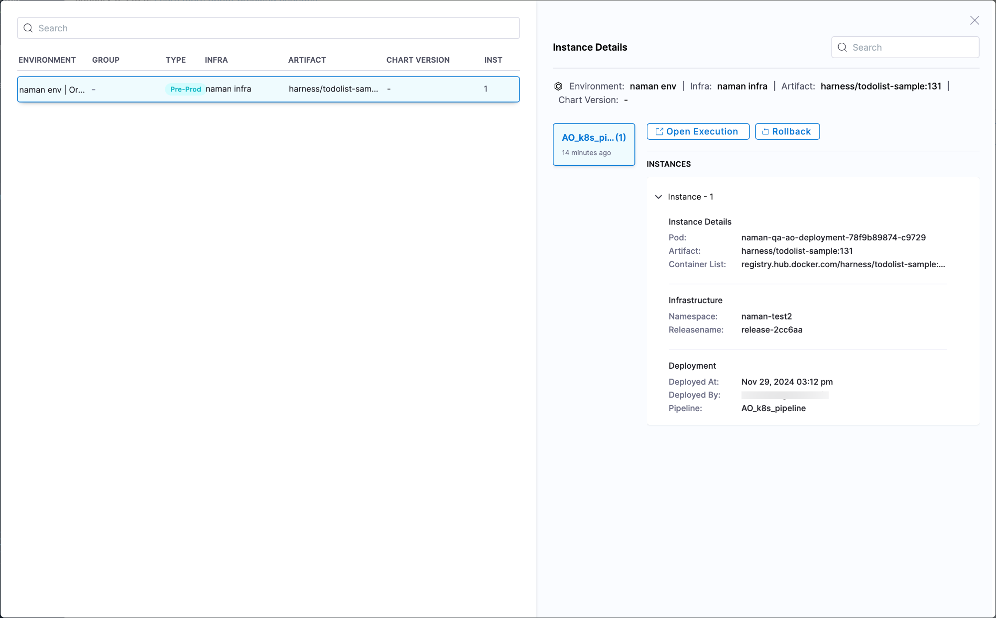 2. Click on View Instance and Rollback. All executions will be displayed along with their environment details. You can only perform a rollback in the Environment view.
