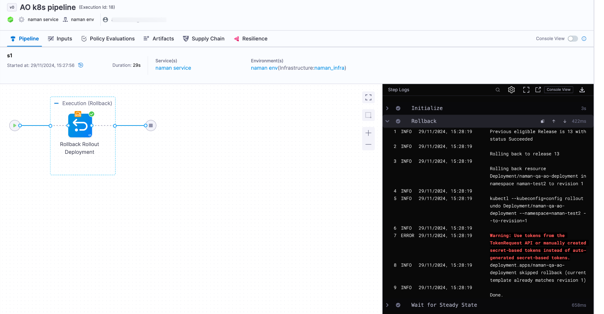 You will be directed to the pipeline execution page, and the Rollback Rollout Step will be executed.