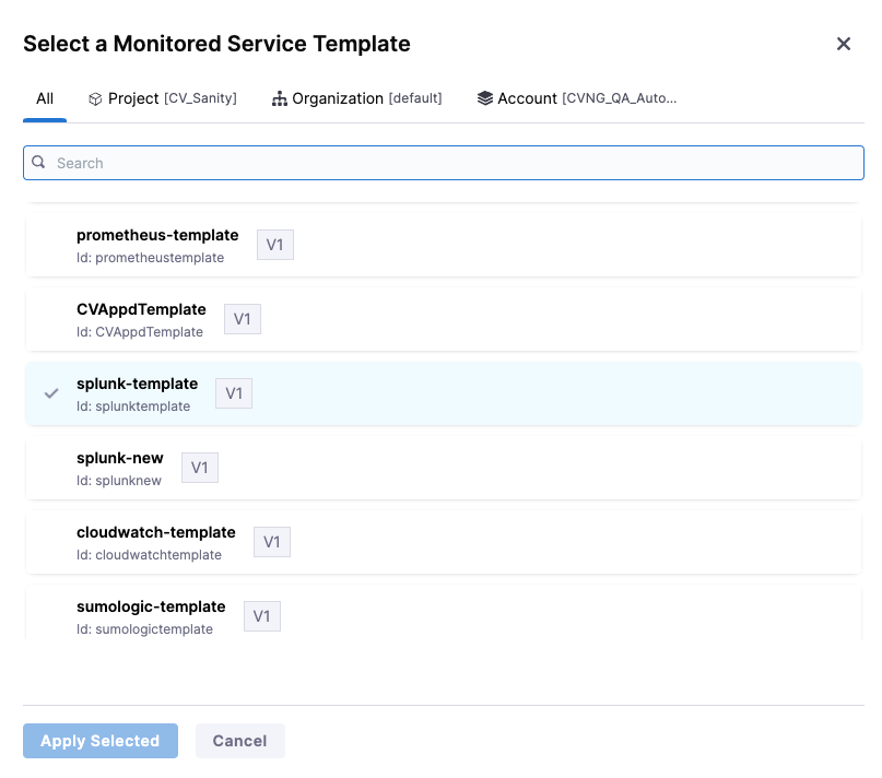 To select a monitored service template, select Template under Monitored Service > Monitored Service Type in the Verify step configuration page. The template input can be a fixed value or runtime input.