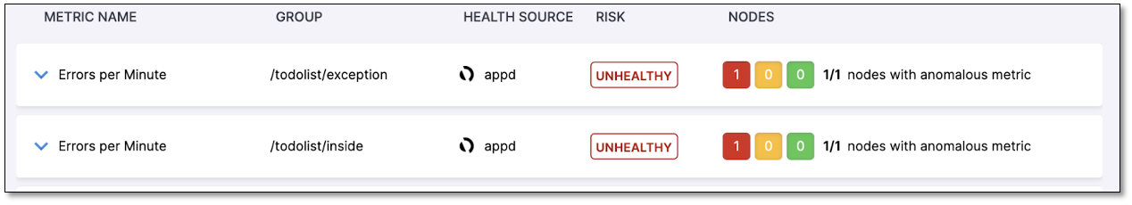 • Nodes: This is a summary of the metric's risk across all available nodes, including "Canary" or "After" nodes. It displays the risk level using color-coded indicators that represent the three risk categories: Healthy (indicated in green color), Observe (indicated in orange color), and Unhealthy (indicated in red color). The node summary helps in understanding the overall risk associated with the metric across different nodes in the system.