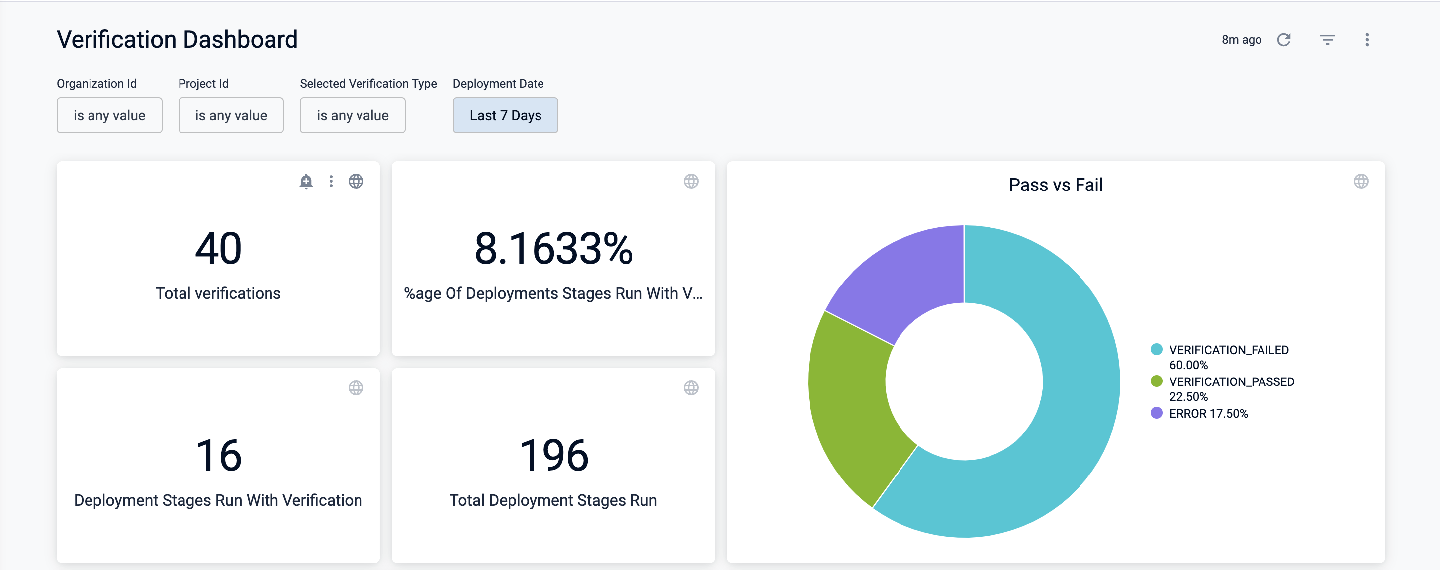 Harness provides many out-of-the-box dashboards, including the Verification Dashboard. To learn more about Harness Dashboards, go to Harness Dashboards