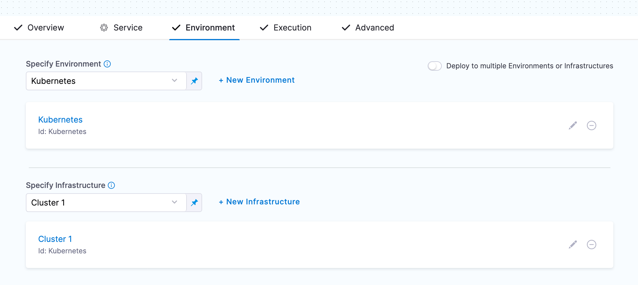 2. In Environment, select a single environment and infrastructure. You don't need to enable Deploy to multiple Environments or Infrastructures.