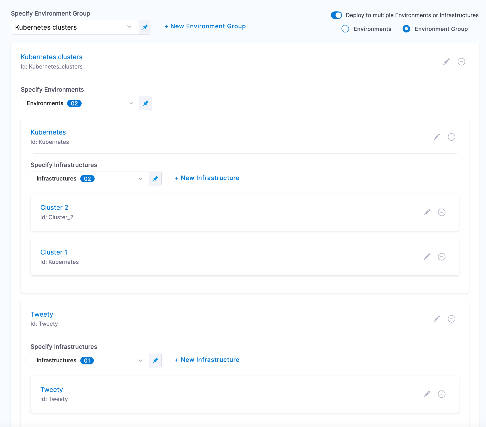 1. In Environment, select Deploy to multiple Environments or Infrastructures, and then select Environment Groups.