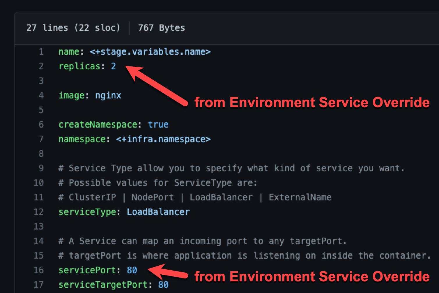 An environment's Service Overrides values YAML has the name:value pairs replicas: 2 and servicePort: 80.
