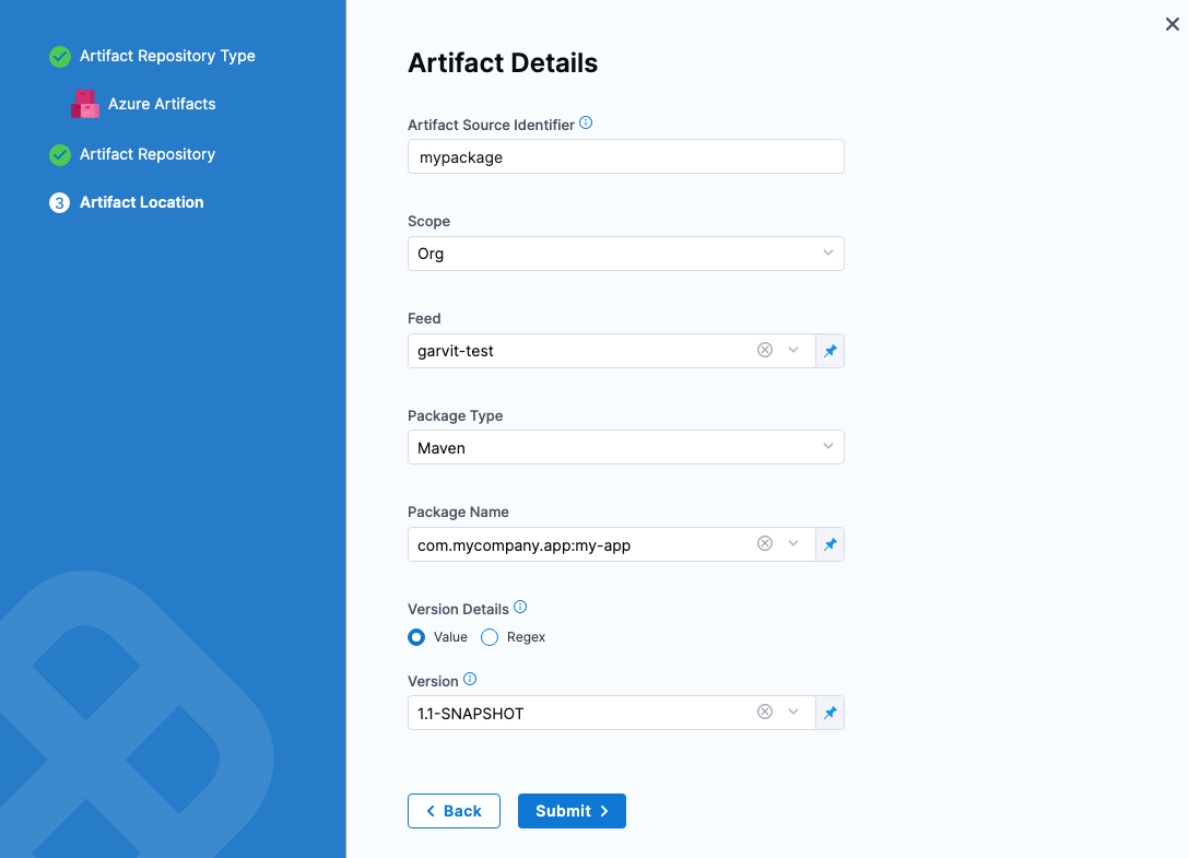 When you select the artifact repo for the artifact, like a Docker Hub repo, you specify the artifact and tag/version to use.