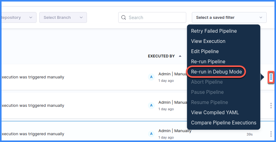 3. Locate the build you want to troubleshoot, select More Options (⋮), and select Re-run in Debug Mode.
