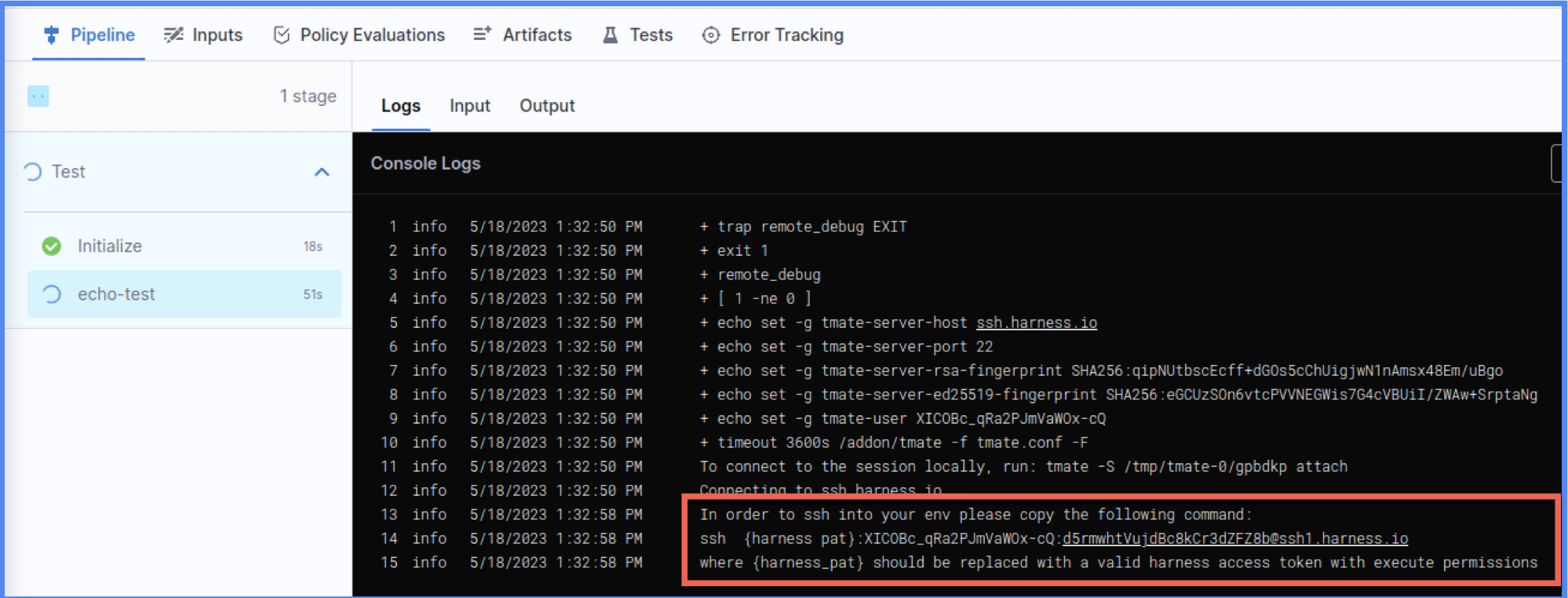 ssh {harness pat}:<your-harness-account-ID>:<random-session-token>@tmate.harness.io