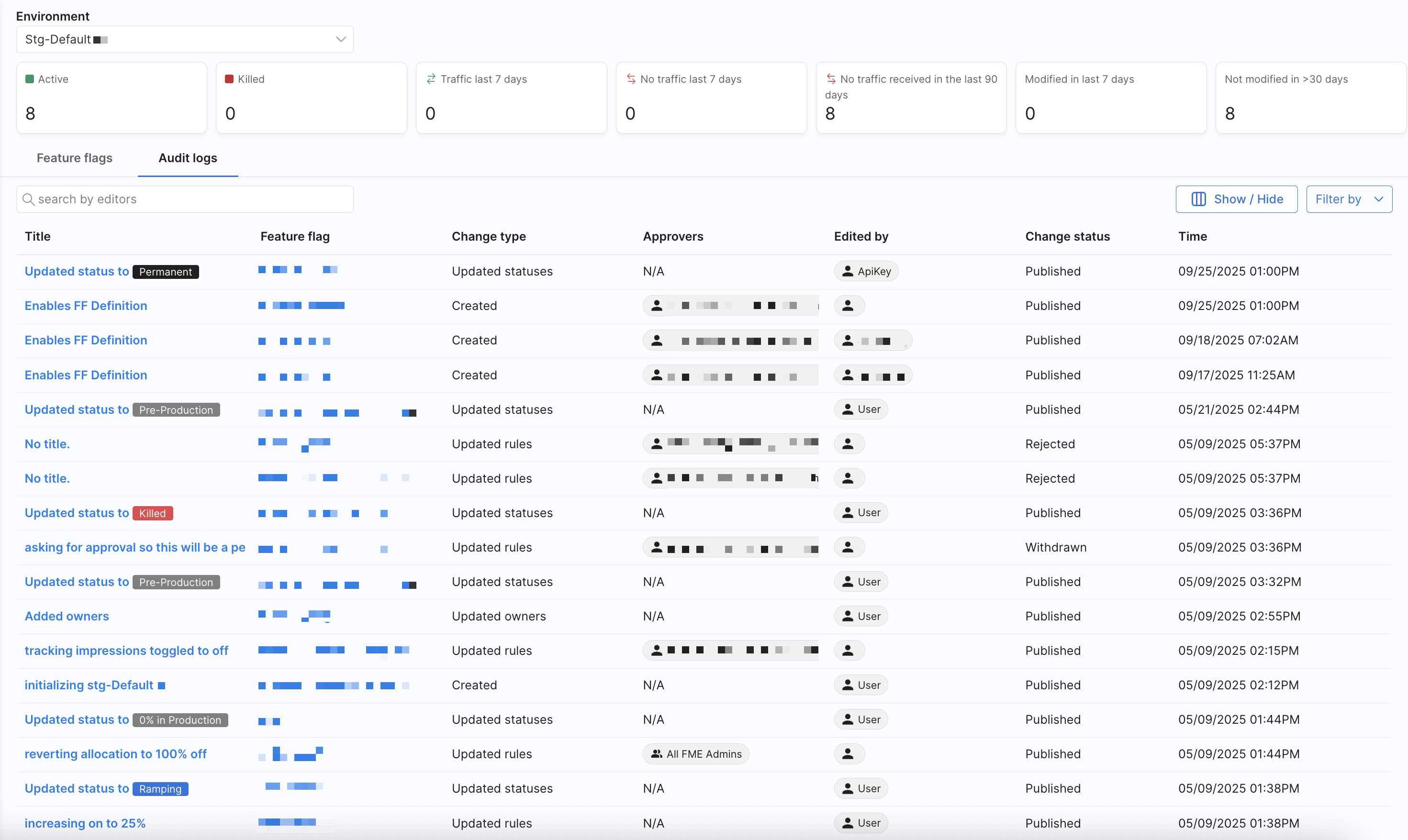 The Audit logs tab on the Environments page provides a history of changes made to feature flags in the selected environment. Each entry in the audit log list includes information about the title, feature flag, change type, approvers, who edited the feature flag, version, change status, and the time.