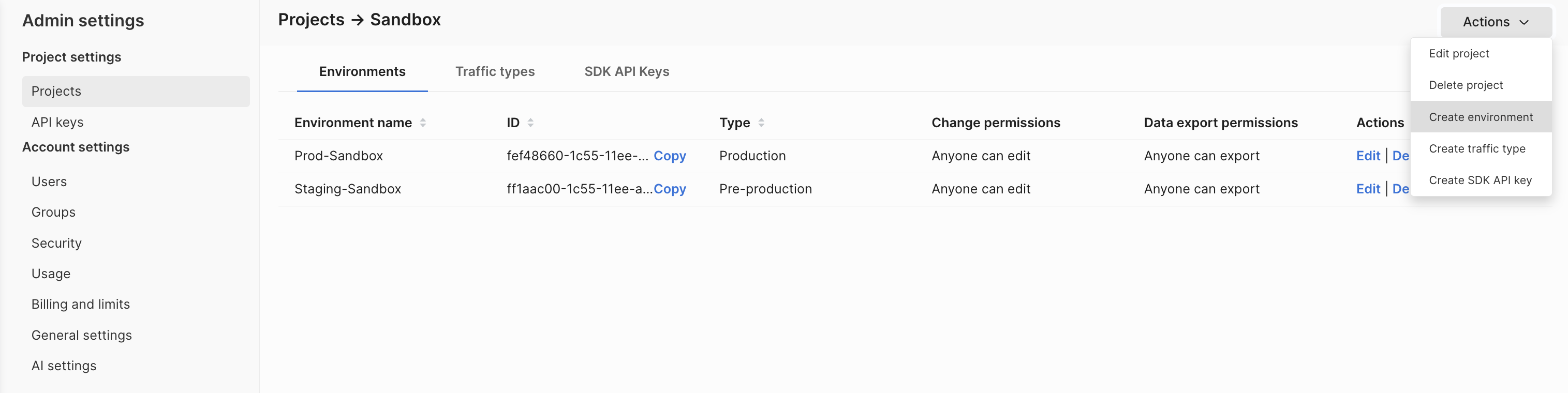 When you first create your account, you are provided with two environments. To manage your environments, go to the Projects tab in your Admin settings page. Select the project that you want to edit environments for. You can: