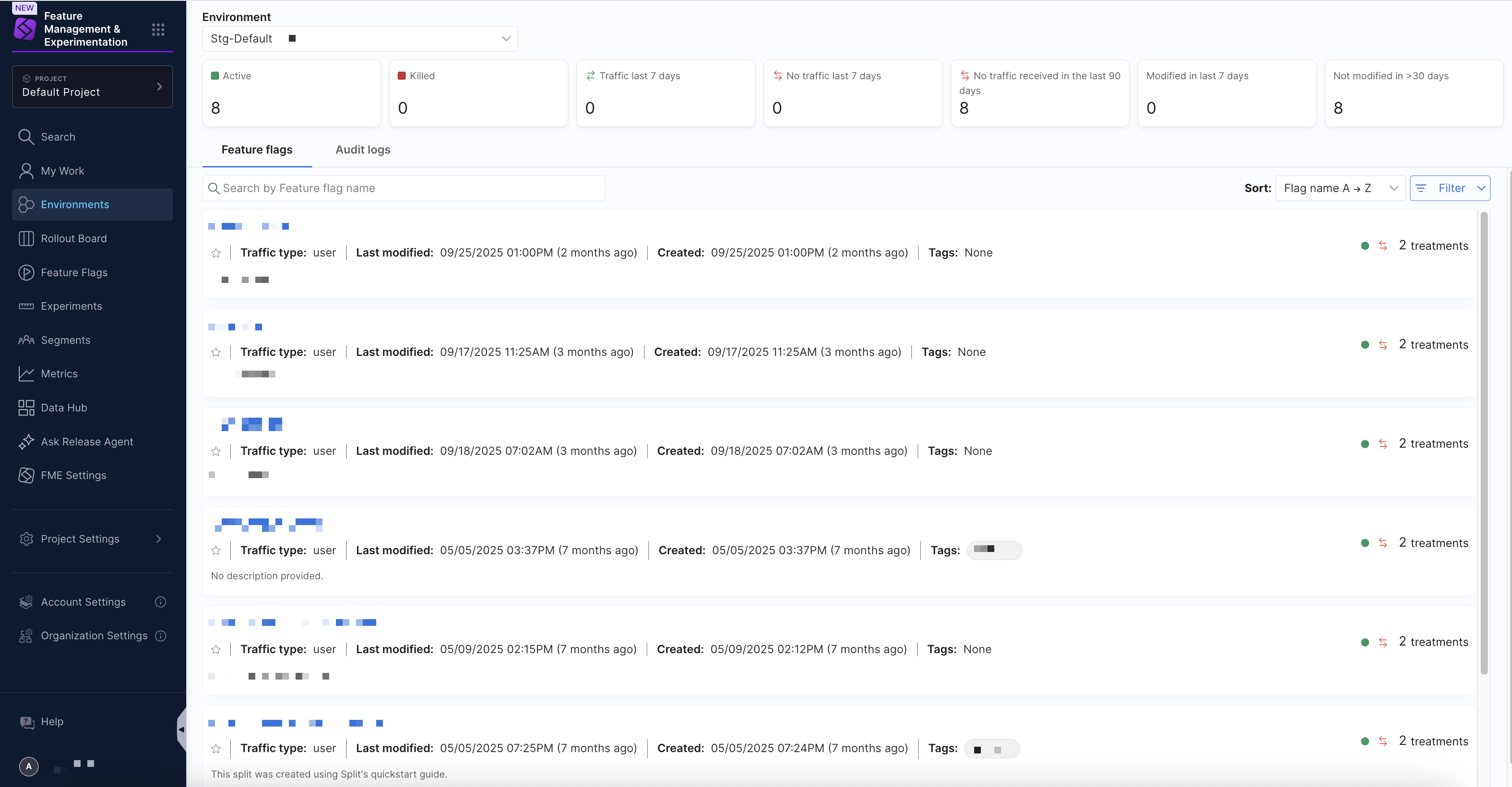 Using the Environment dropdown menu, you can select an environment to display all configured feature flags along with their current status (Active or Killed) and recent traffic activity. You can filter feature flags by name in the search bar, use the Sort dropdown menu to order flags by name, last modified date, or creation date, in addition to a Filter dropdown menu to narrow results by traffic type, tag, status, or traffic activity.
