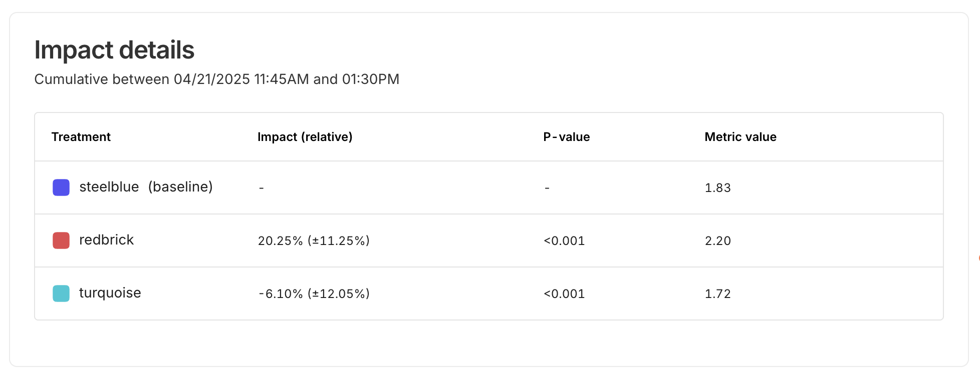 The Direction field provides a quick interpretation of whether the results for a treatment align with your defined goals. The Impact column shows the relative difference between the treatment and the baseline, along with its confidence interval. The P-value helps you understand the statistical significance of the observed impact; a low p-value (commonly < 0.05) suggests that the observed difference is unlikely due to random chance. The Value column displays the actual observed metric value for the treatment group, offering context for the size of the effect.