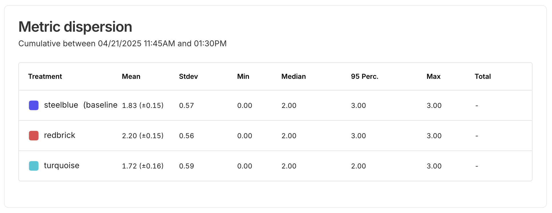 The Metric dispersion chart provides full details of statistical results for data analysis. This chart summarizes the metric data for all treatments over the course of the experiment.