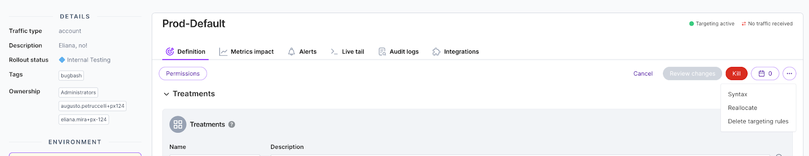• During the release, a critical issue is found and the feature flag is immediately killed, sending all customers to the default treatment.