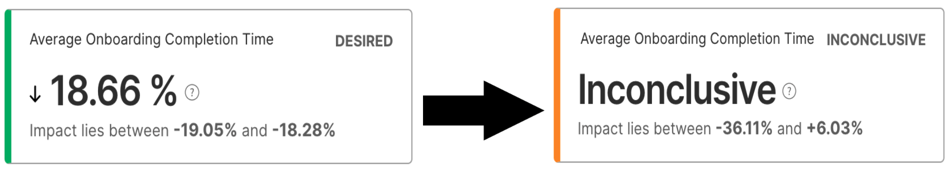 A metric is inconclusive when, based on a statistical analysis, the system cannot confidently indicate whether it had a desired or undesired impact. Alongside the measured difference between the treatments, we show the confidence interval around this measured value via the ‘impact lies between’ text on the metric cards. When a metric is inconclusive, the confidence interval will include 0% impact since we have not been able to rule out the possibility that the treatment has no or negative impact on your metric.