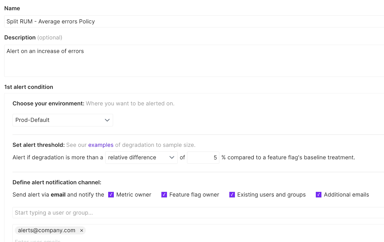 Feature flag alerting immediately notifies you when a feature flag key metric achieves significance, allowing you to have confidence in the impact of your new feature. Alert policies will alert you immediately to a guardrail metric being hit, ensuring that service degradations can be acted upon swiftly.