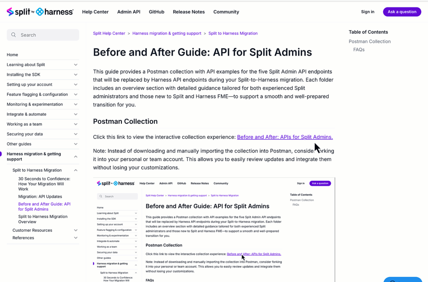This guide provides a Postman collection with API examples for the five Split Admin API endpoints that will be replaced by Harness API endpoints during your Split-to-Harness migration.
