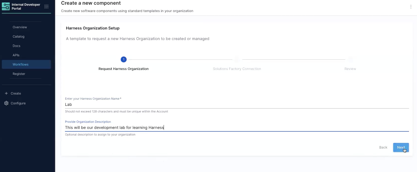 Harness Organization Setup→ Enter name and description → Next → Review → Create