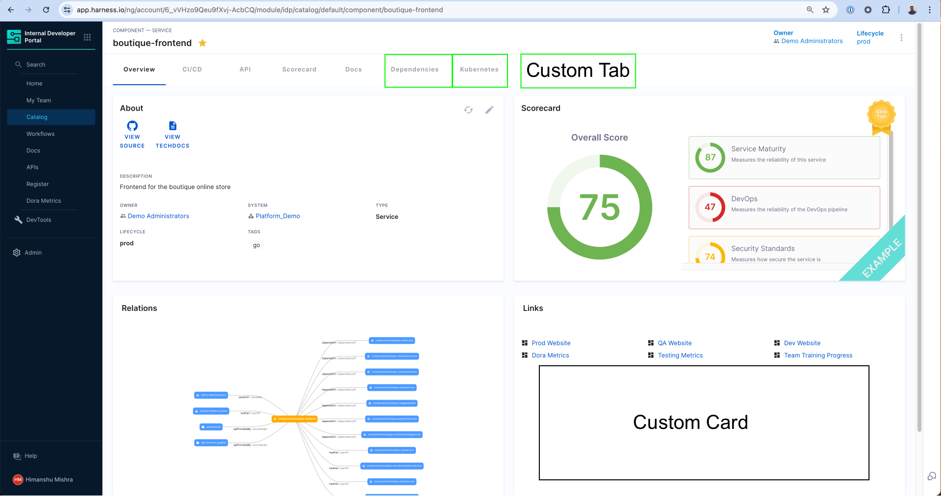 You can embed an iframe on a Catalog entity’s detail page with the EntityIframeContent component. This enables you to display external web pages directly inside the entity view in Harness IDP.