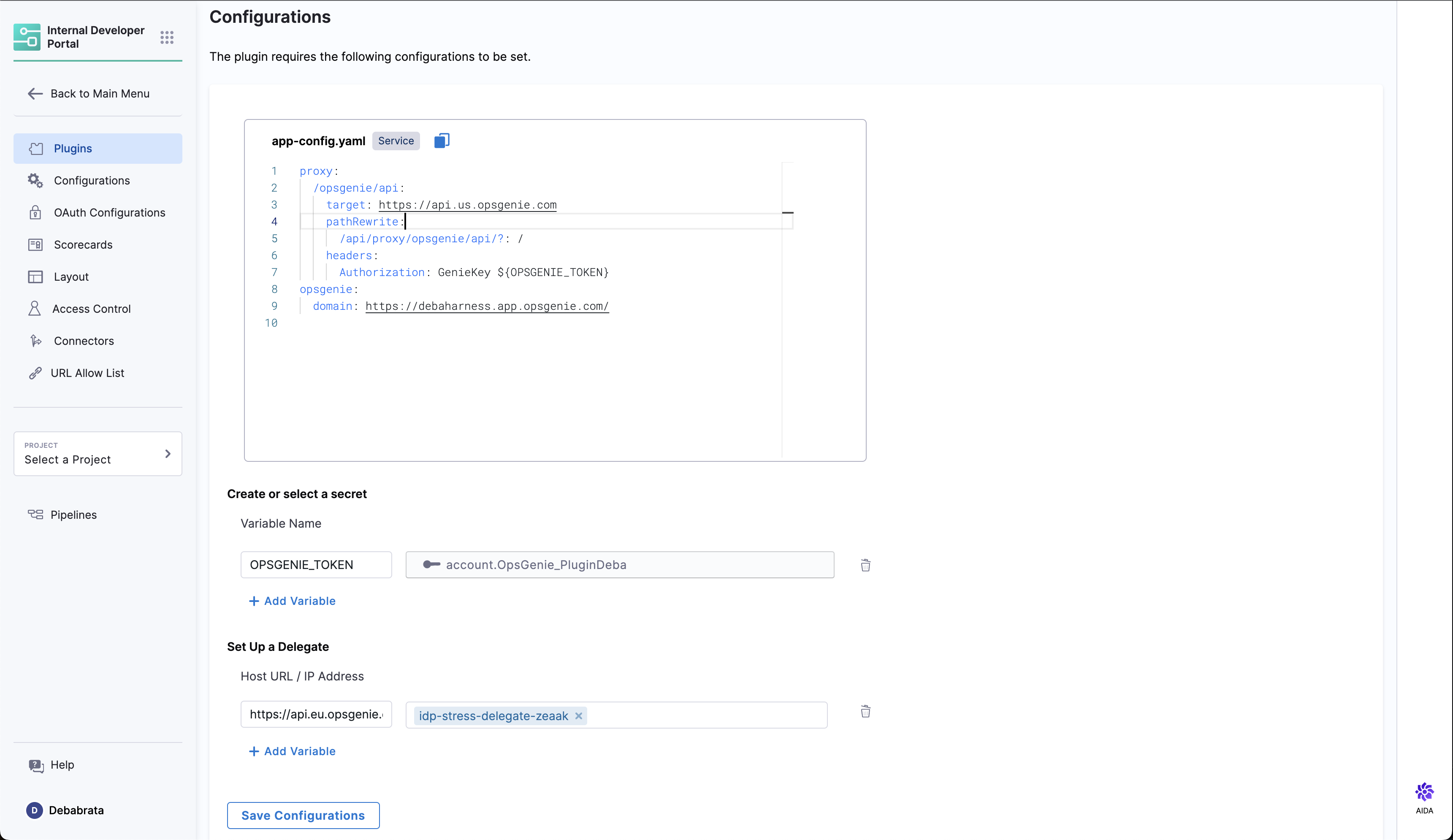 • Under the Plugins tab in Admin, go to app-config.yaml and Edit YAML to configure your Opsgenie instance in the target field and add your domain in the format as shown below.