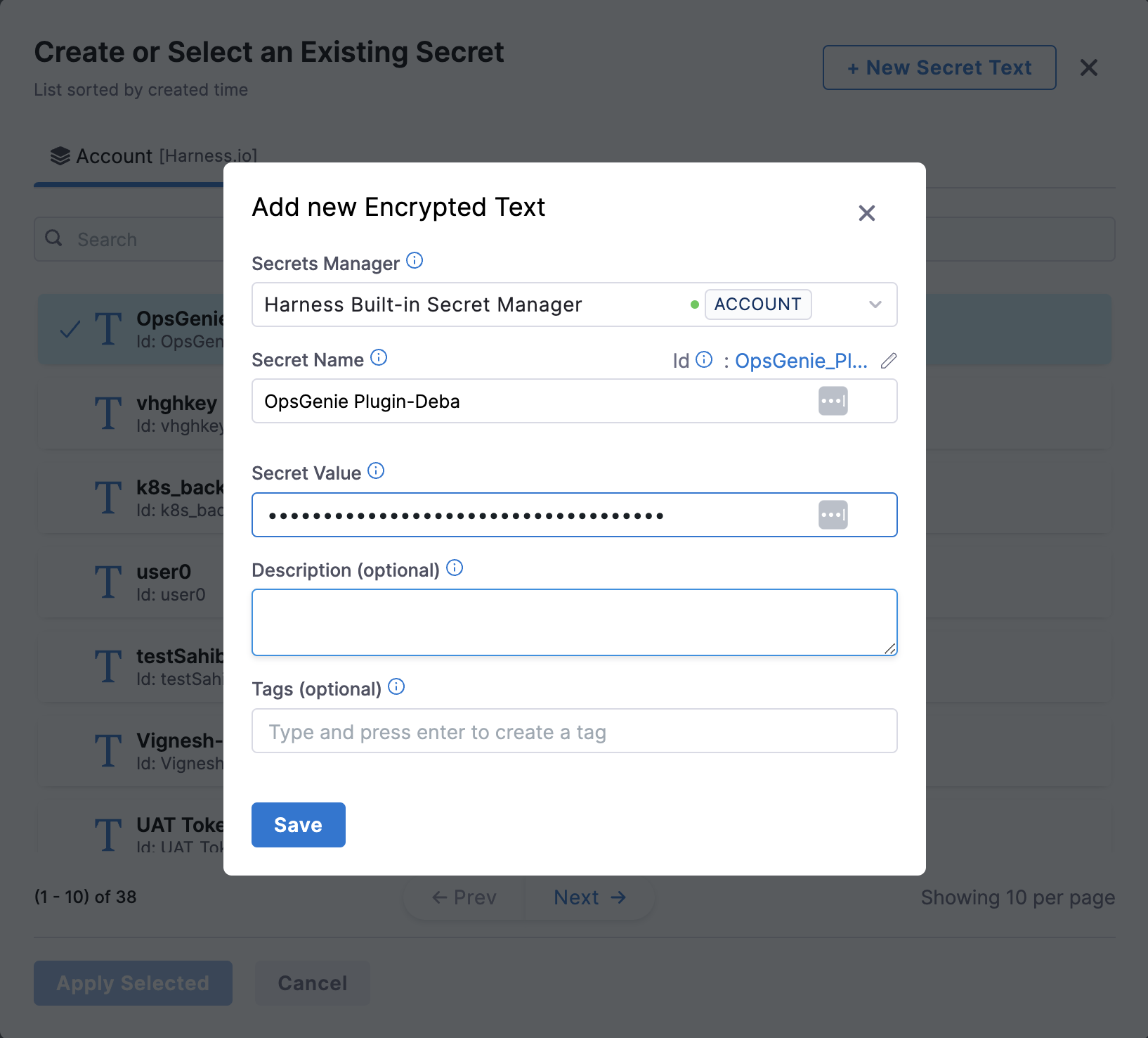 • Create secret in Harness to store API token, click on “New Secret Text” and enter values as shown below.