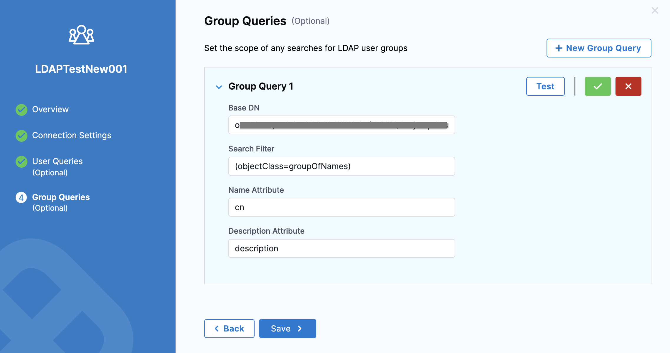 In Base DN, enter the distinguished name of the LDAP group you want to add. This should be the LDAP group containing the users you searched for in User Queries. To see a list of all the groups in your LDAP directory, use this dsquery command: