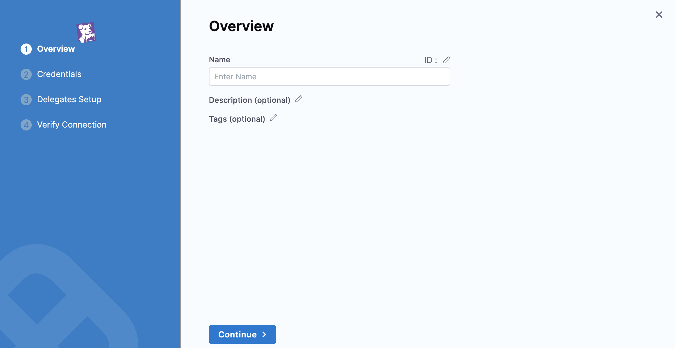 In the Overview tab, enter a name for the connector, an optional description, and a tag, and then select Continue. If you are going to use multiple providers of the same type, ensure you give each provider a different name.