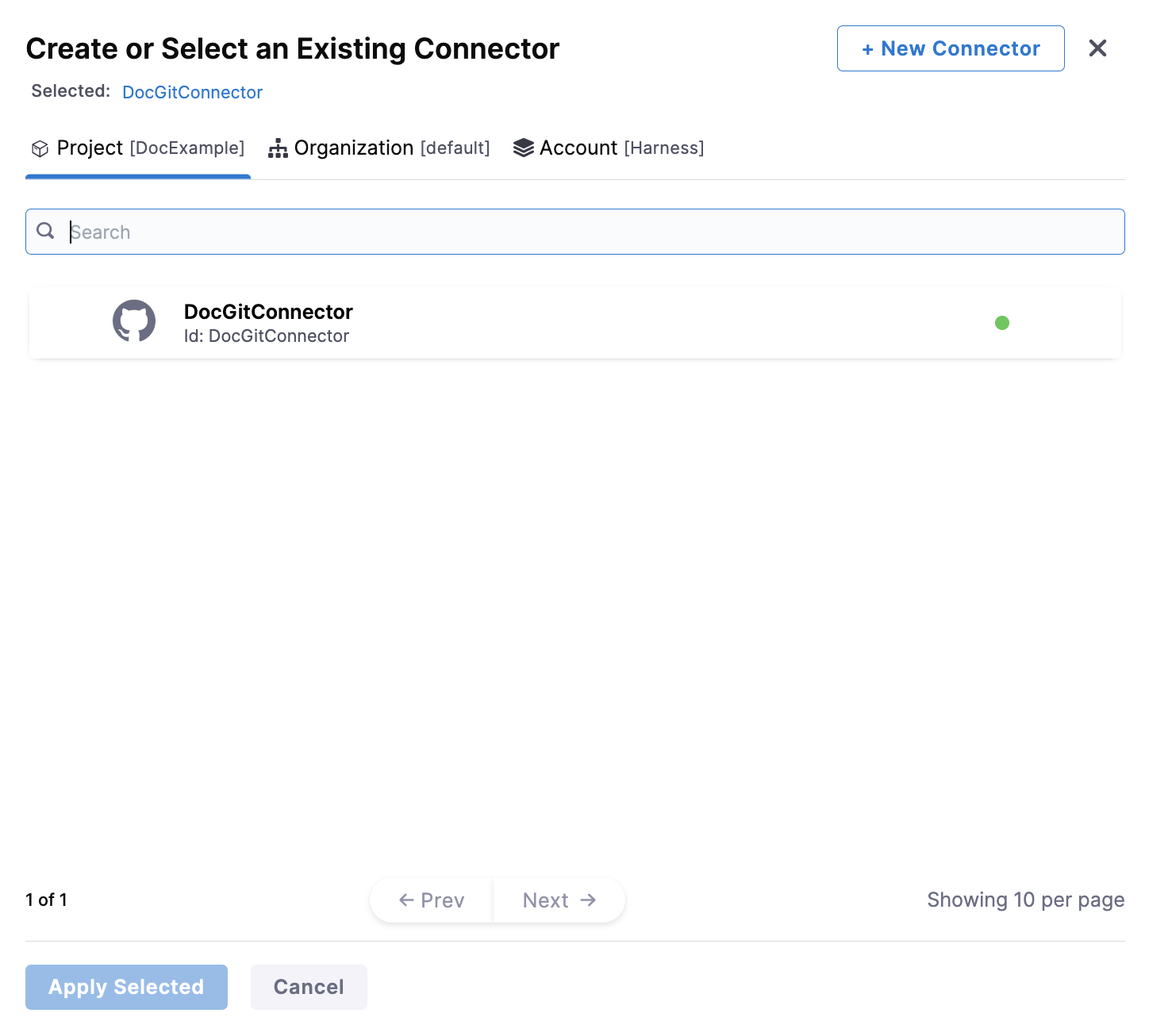 Otherwise, in Git Connector, select or create a Git Connector for your project's repo. For steps, go to Code Repo Connectors.