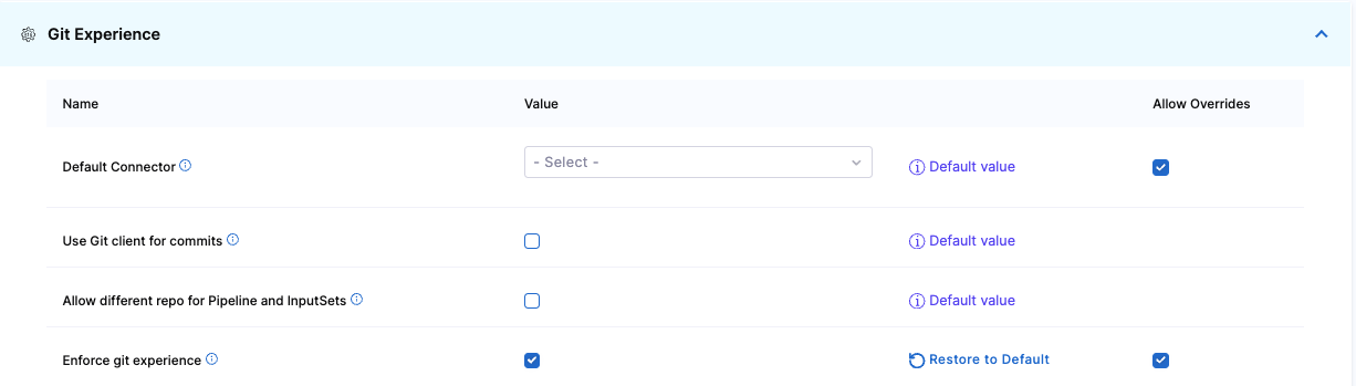 4. To override this setting in the child scopes, select Allow Overrides beside the settings. This forces configurations at the account scope to be saved in Git repositories only. Users can, however, still create inline pipelines and templates at the organizational and project levels.