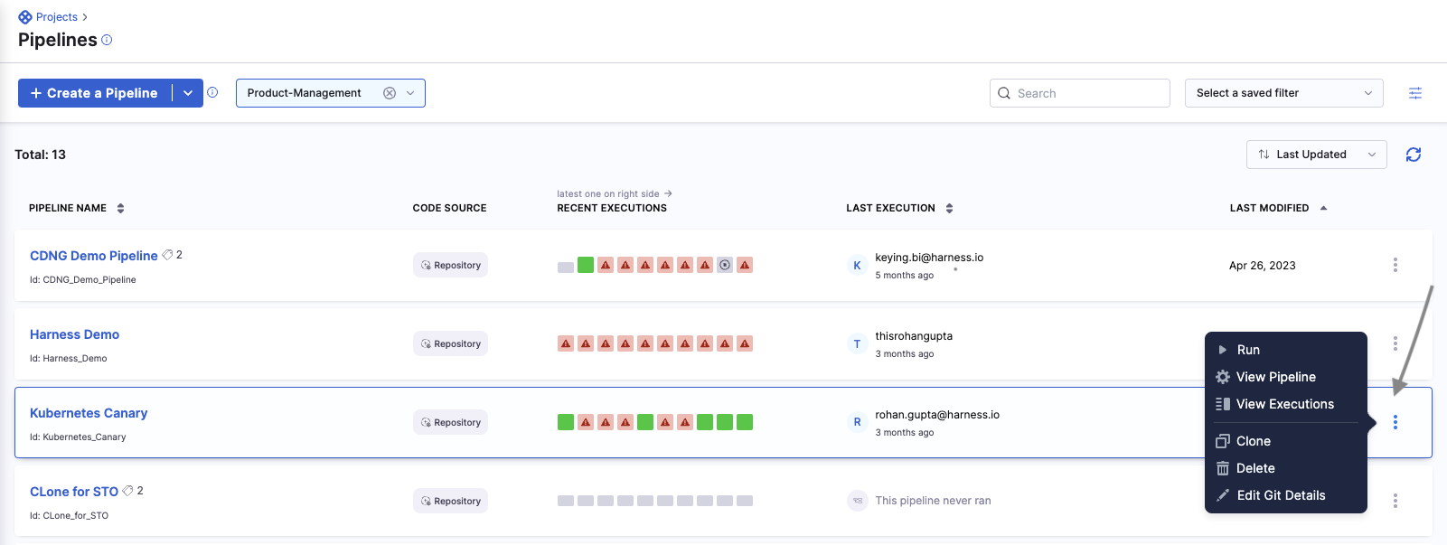 2. Go to the pipeline where you want to edit the Git details, and select more options (⋮).