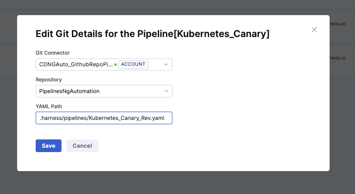 Harness pre-populates the YAML Path. You can change this path and the file name. All your configurations are stored in Git in the Harness Folder.